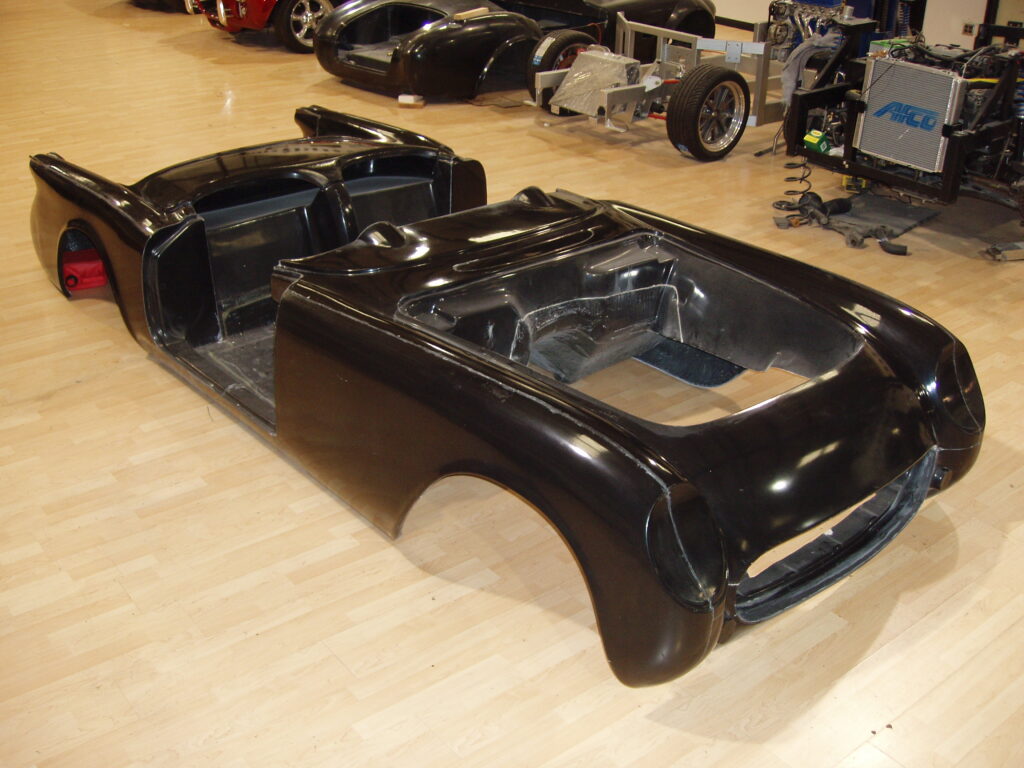 These bodies are made with a two-piece main shell (front and rear clips, bonded at the center of the rocker panel), and include all of the original fiberglass components: hood, doors, trunk lid, hatch, dash, center console, glovebox, inner fenders), as well as steel rocker braces. When ordered as a complete body, the hinges are hung, but latches are not included. A new core support is included as well. VIN numbers are available.